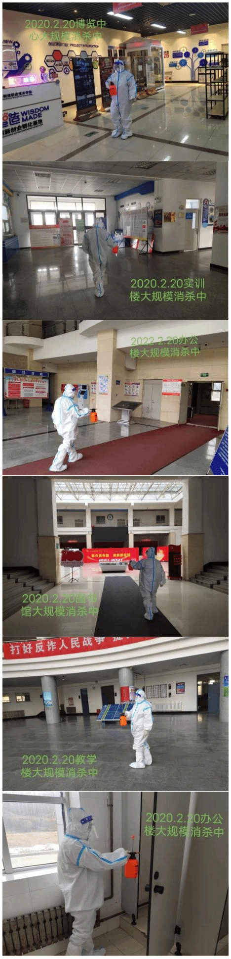为全面做好新冠肺炎疫情防控工作,保障学校全体学生的身体健康和生命安全,给广大师生营造一个平安健康的生活、学习环境。在2022年2月20日(教工返岗前一日)和2022年2月25日(高职学生返校前一日),我校组织保洁人员开展两次全校公共区域全面消杀,扎实做好疾病防控工作。