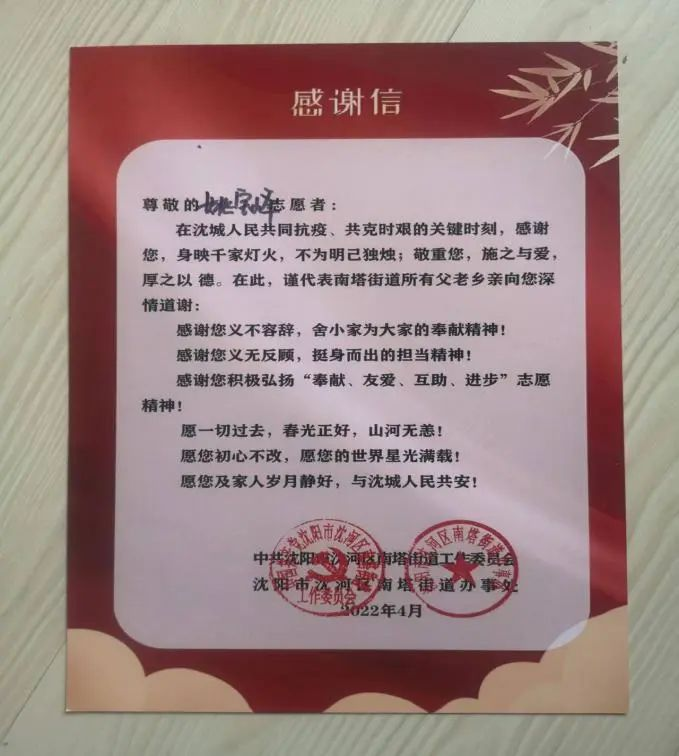 姚宝锋参加社区防疫志愿服务工作及社区感谢信
