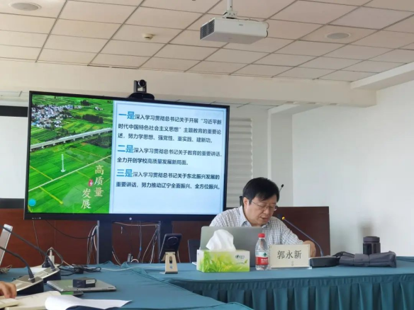 郭永新回顾了前一阶段学校主题教育工作进展情况。学校紧紧围绕“学思想、强党性、重实践、建新功”总要求,把理论学习、调查研究、推动发展、检视整改贯通起来,有机融合、一体推进,努力在深学细照笃行中提高理论素养、坚定理想信念、升华觉悟境界、增强能力本领。郭永新指出,推动高质量发展,要从习近平新时代中国特色社会主义思想中汲取智慧和力量。要全面落实以学增智要求,在提升政治能力、思维能力、实践能力中培育推动高质量发展的生力军。一是为信仰“提纯”,把“看家本领”学到手,练就“政治鉴别”的“敏锐性”;二是为党性“淬火”,把“兴党本领”学到手,练就“忠党爱民”的“金刚身”;三是为事业“燃烧”,把“强国本领”学到手,练就“劈波斩浪”的“硬功夫”。郭永新强调,推动高质量发展,要深刻把握习近平新时代中国特色社会主义思想的世界观和方法论。一是必须坚持人民至上,守好根本价值立场;二是必须坚持自信自立,彰显内在精神特质;三是必须坚持守正创新,弘扬时代理论品格;四是必须坚持问题导向,把握创新源头活水;五是必须坚持系统观念,用好基本工作方法;六是必须坚持胸怀天下,展现新的格局境界。郭永新希望,广大党员在今后工作中能够常态化跟进学习党的创新理论,持续开展调查研究,随时检视整改问题,进一步用习近平新时代中国特色社会主义思想强基铸魂、提升本领、推动工作,助力辽宁全面振兴、全方位振兴,着力培养担当民族复兴大任的时代新人。