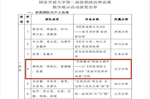 近日,由国家开放大学组织开展的第二届思想政治理论课教学展示活动评比结果揭晓,我校报送的5件作品荣获一等奖1项,优秀奖2项。其中谭晓燕团队作品《“四维融合”体验式教学——以<思想道德与法治>“发扬中国革命道德”为例》获一等奖;陈晓飞团队作品《用“活”地区红色资源,打造“三维”立体化课堂》和杨娇团队作品《白山黑水间写下不朽史诗——东北抗日联军与“三大法宝”》分别获得优秀奖。我校获得优秀组织奖。
