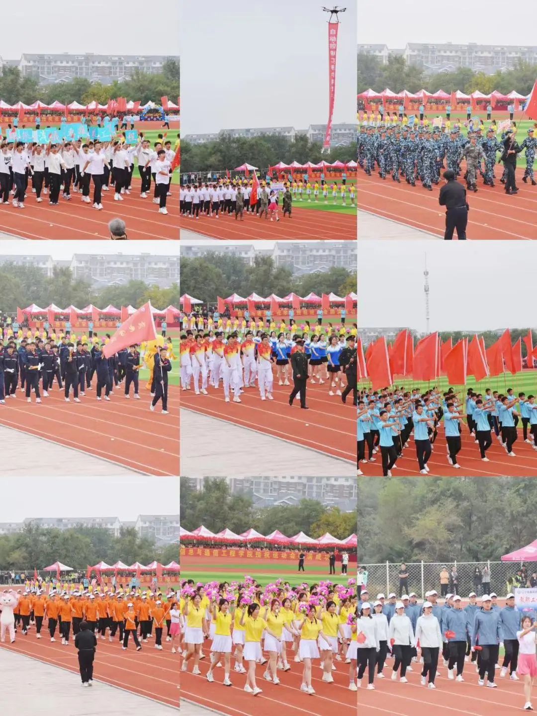 开幕式上,国旗队、旗海方队、裁判员和各代表队方阵依次入场,他们将歌舞、造型展示等创意元素与队列表演相融合,为全体师生呈现了一场精彩纷呈的视觉盛宴,朝气蓬勃的精神面貌赢得了在场观众的阵阵掌声。慷慨激昂的音乐、迎风飘动的彩旗、横幅宣传标语和各方阵队响彻的口号,将会场气氛推至高潮。