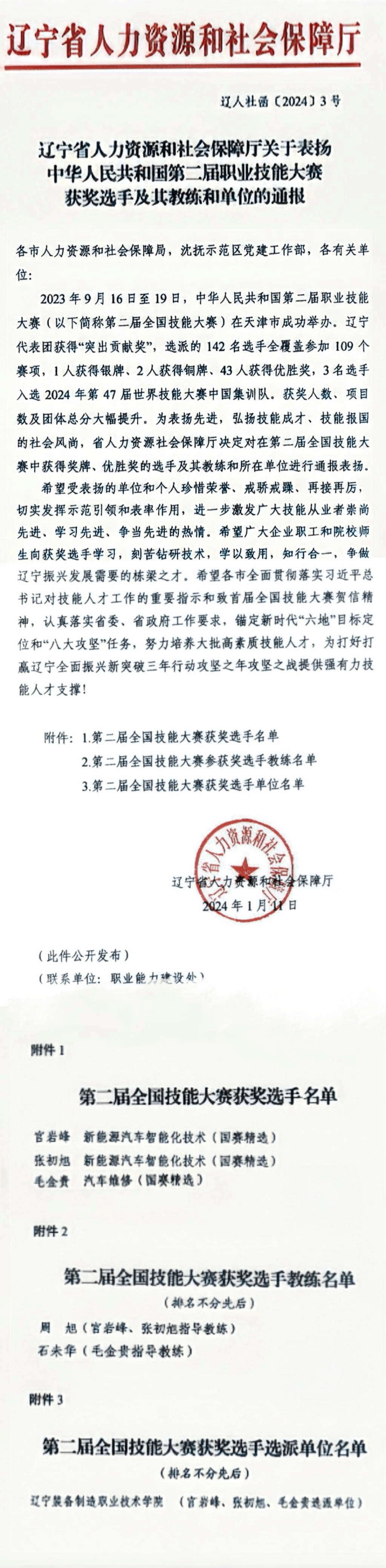 近日,辽宁省人力资源和社会保障厅发布《关于表扬中华人民共和国第二届职业技能大赛获奖选手及其教练和单位的通报》,表扬在第二届全国技能大赛中获得奖牌、优胜奖的选手及其教练和所在单位。我校汽车工程学院张初旭、宫延峰、毛金贵三位教师作为获奖选手,周旭、石未华两位教师作为教练,学校作为选派单位同时获得表扬。