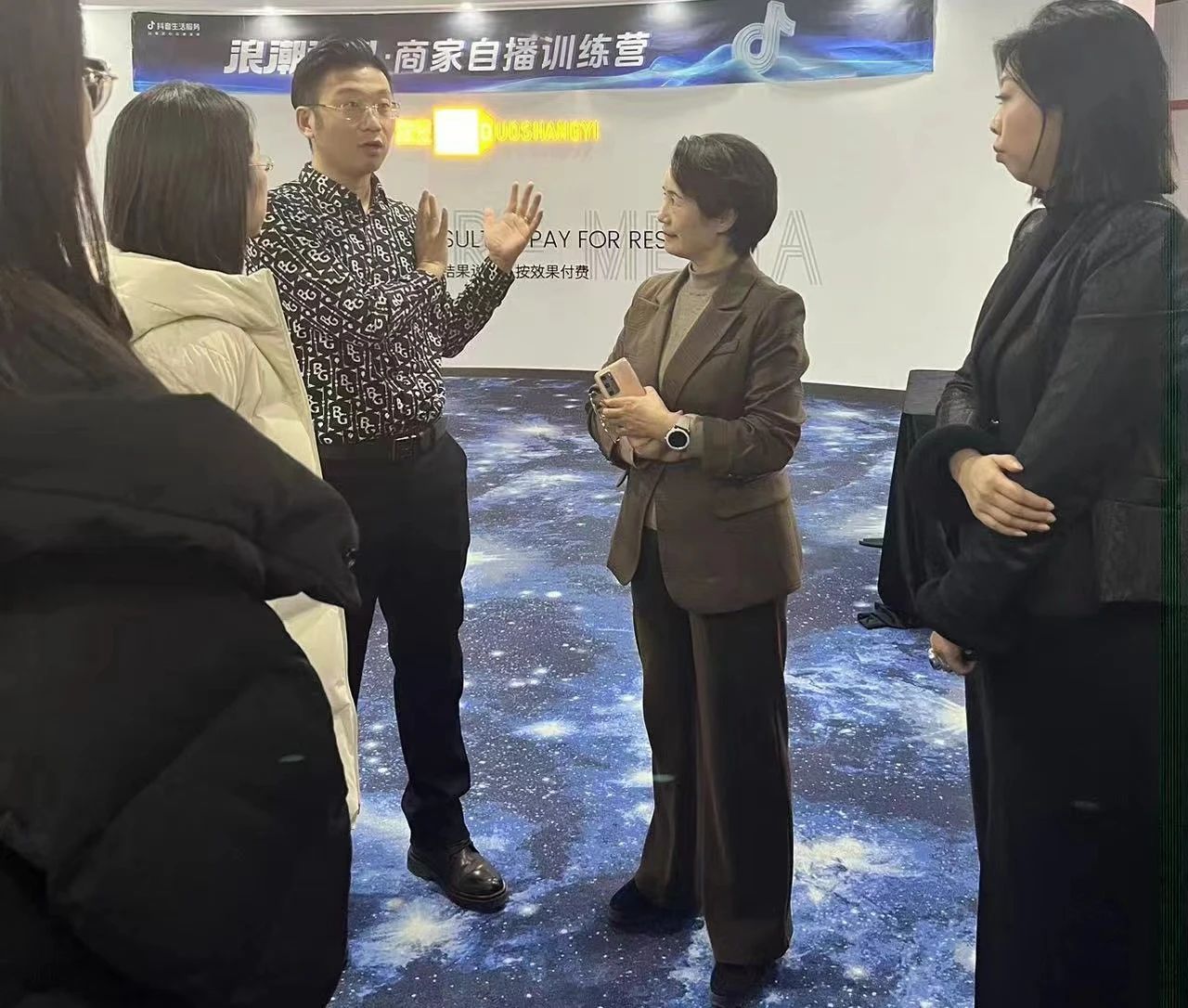 座谈会后,张秀丽一行参观了公司的直播基地,以及在企业实习学生的直播现场。