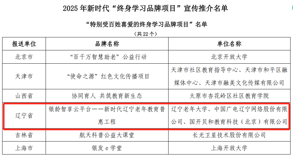 4月11日,中国成人教育协会下发了《关于公布2025年新时代“百姓学习之星”和“终身学习品牌项目”宣传推介名单的通知》,辽宁老年大学培育的"银龄智享云平台——新时代辽宁老年教育普惠工程"获评全国"特别受百姓喜爱的终身学习品牌项目"。